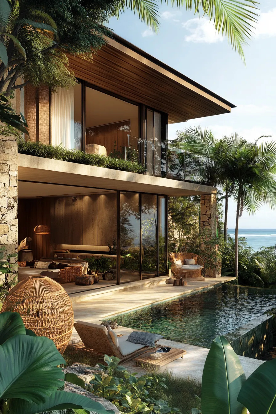 Phong cách Tropical mang hơi thở thiên nhiên, đặc trưng bởi mái rộng, nhiều cây xanh và vật liệu tự nhiên như gỗ – đá. Đây là xu hướng được nhiều gia chủ ưa chuộng tại khí hậu nhiệt đới Việt Nam.