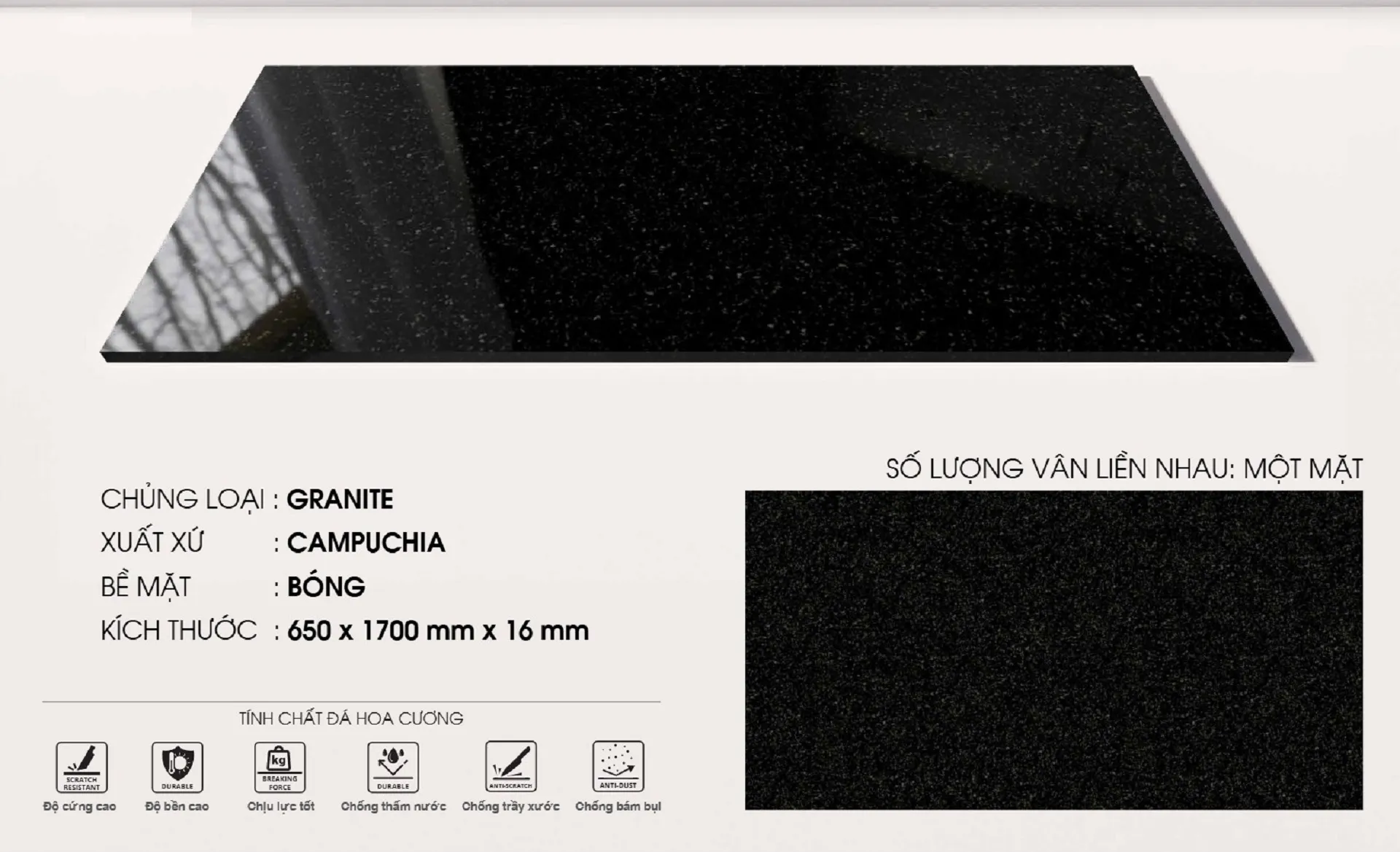 Đá Granite nổi tiếng với độ cứng và độ bền vượt trội, khả năng chống mài mòn cao. Về mặt thẩm mỹ, mỗi tấm đá là độc nhất vô nhị về vân và màu sắc, mang lại vẻ đẹp tự nhiên không thể sao chép.
