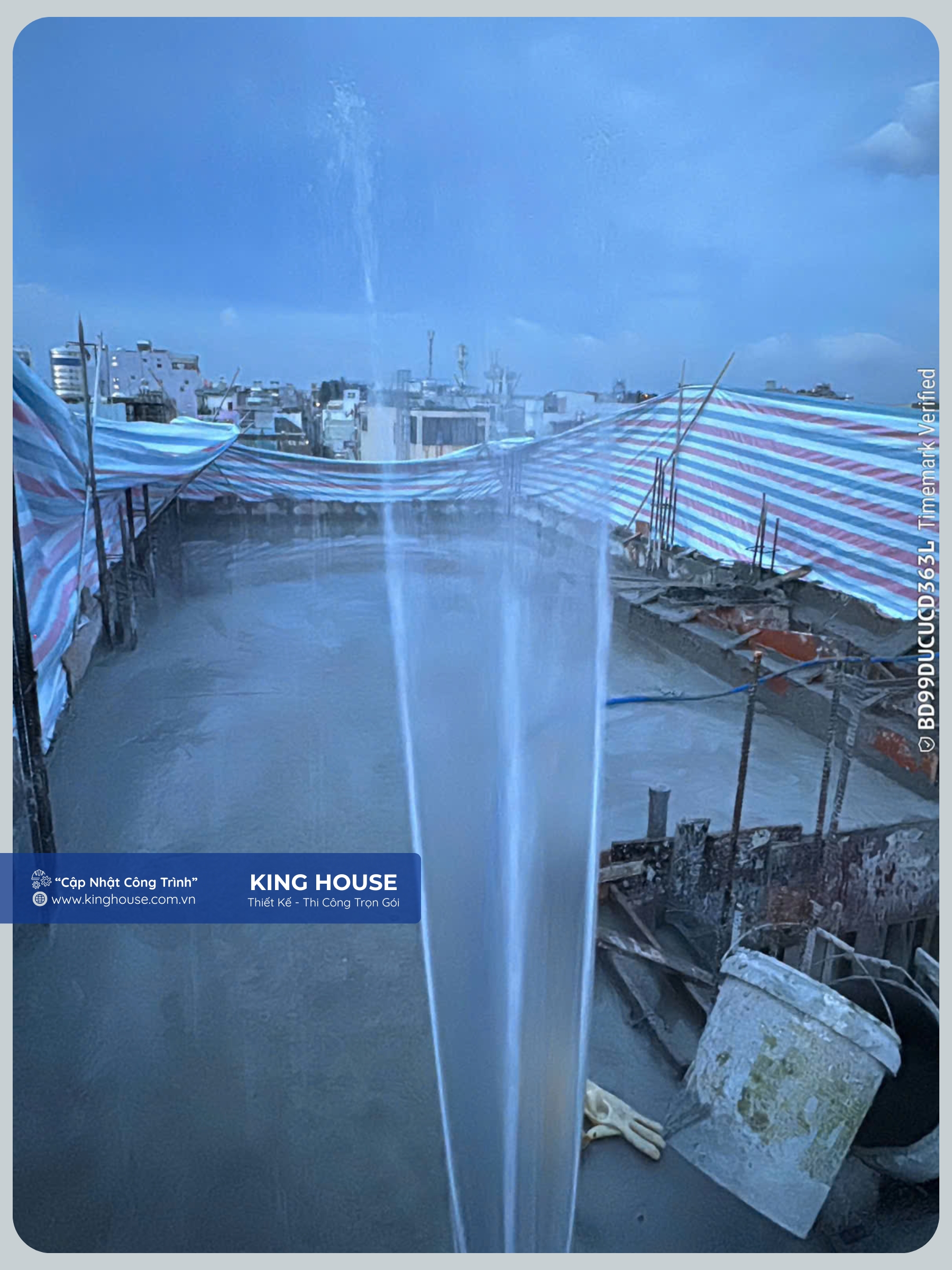 Tại King House, 100% công trình sử dụng con kê bê tông và được thực hiện nghiêm túc quy trình bảo dưỡng sau đổ bê tông – trong đó, tưới nước bảo dưỡng là một bước then chốt quyết định chất lượng, thẩm mỹ và độ bền vững của công trình.